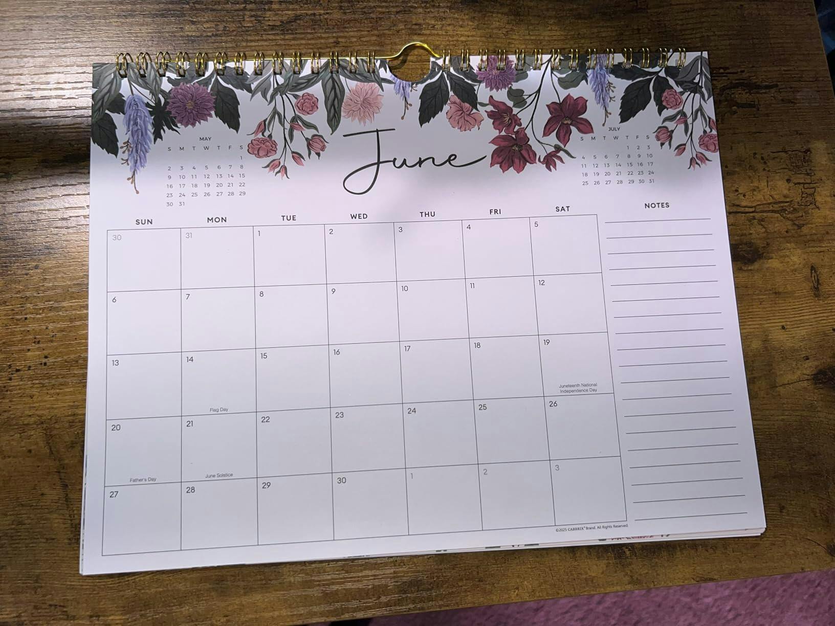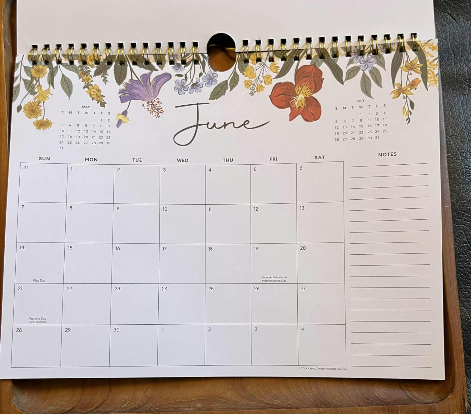 This is a really nicely made wall calendar featuring pretty floral designs and a very lovely font for each month. The boxes are good and large to write anything on the days. It has both US and Canadian holidays including up to date things like Juneteenth! I really like the gold hangar for your wall and how you can flip it over without having to tear it off each month. Overall, I'm pleased with the paper quality also.
