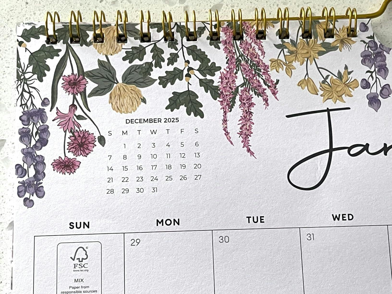 I got this calendar to lay on my desk because traditional desk calendars are too big for my space. This fit perfectly. Each page is printed on nice paper stock. The flowers are lovely and the date boxes are large enough for appointments and birthdays. Beautiful way to get organized in 2026.