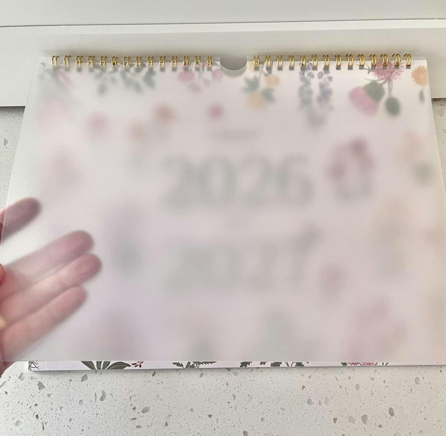 I also love that this calendar is 18 months, it gets us all the way through June 2027. In the pictures you will see that there is a thick plastic covering over the top to protect the top page of the calendar.